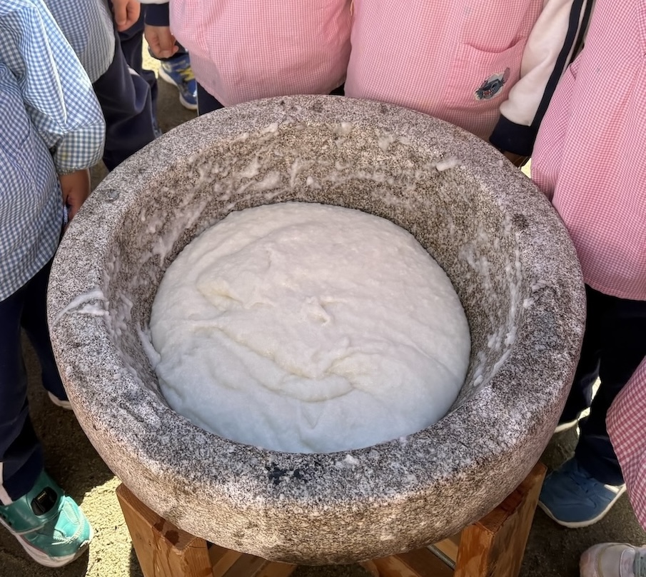 「わこうのいいね!」#198 「よいしょ!よいしょ!」という掛け声で、おもちつきをしました。 あおぐみさんと先生がついた後、ふわふわになったおもちをみんなで囲みました。 お部屋に帰って、おもちつきをする子どもの姿もありました。