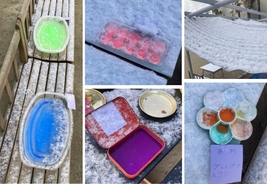 園庭にうっすらと雪が積もった朝、あおぐみさんが前の日に置いておいた色水を見てみたら、、