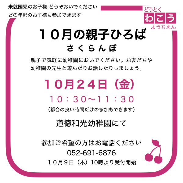 令和7年度10月「さくらんぼ」のお知らせ 10月も親子ひろば「さくらんぼ」を開催します! 親子でお友だちや幼稚園の先生と遊んだりお話ししたりして、楽しい時間を過ごしましょう。 幼稚園についての質問や相談も受け付けています。 【10月9日(木) 10時 受付開始】となります。 参加ご希望の方は、幼稚園(052ー691ー6876)にお電話ください。 日にち:10月24日(金) 時 間:10:30~11:30 ※荒天など状況によっては変更になる場合もありますので、ご了承ください。